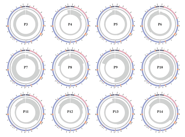 | 圖四: 患者3至14(P3-P14)讀取深度的統計圓形圖。外圈顯示粒線體基因分布圖;紫色、粉色、橘色和深灰色分別標示粒線體基因、rRNA、tRNA和D-loop區域。中間代表粒線體16,569 bp的座標,內圈的灰色區域表示讀取深度分布,用於觀察結構變異(SV)。[1] |